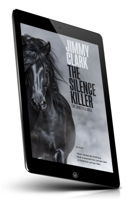 “A powerful black horse with a flowing mane is shown in motion, set against a gray, foggy background.”