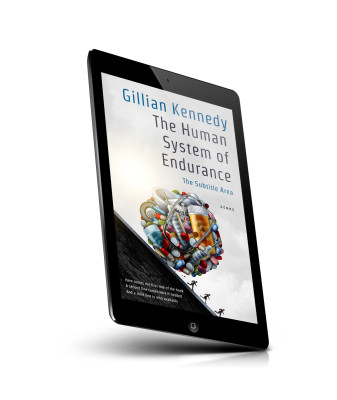 “A human brain made of various pills and capsules on a cover. Silhouettes of people climbing a steep hill on the bottom left.”