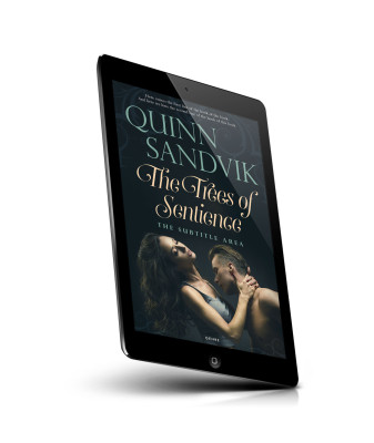 “A dramatic book cover featuring an intimate pose between a woman and a man, with a dark, ethereal background.”