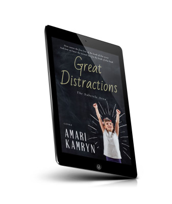 “A young girl stands smiling with both arms raised. The background is dark with the title "Great Distractions" above her.”
