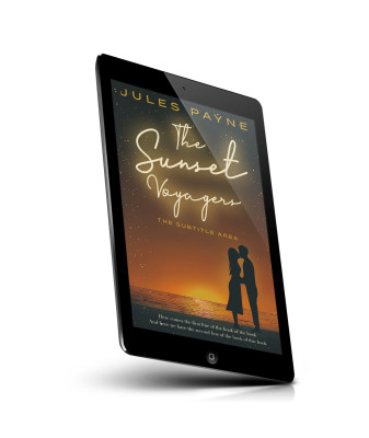 “Silhouette of a couple kissing by the water at sunset with stars in the background.”