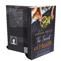 “A person sitting with a tray of healthy food including a salad and a green drink, positioned above a book cover design.”
