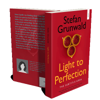 “Red background with three lit decorative lamps arranged in a triangle shape above the title "Light to Perfection."”