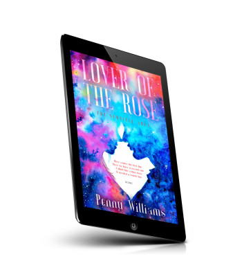 “Colorful cosmic background with a rose silhouette in the center and stylized text overlay.”