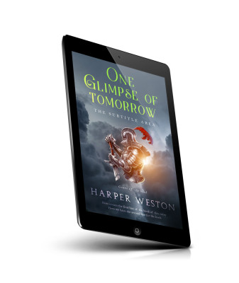 “A knight in armor stands in the clouds, holding a sword with the sun setting behind him. Green and yellow text is positioned at the top.”