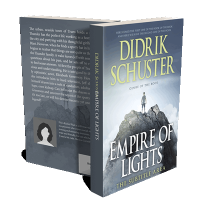 “A person stands atop a rocky peak, surrounded by clouds, underneath the title "Empire of Lights."”