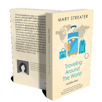 “A travel-themed book cover with luggage and bags, set against a world map background.”