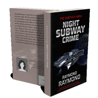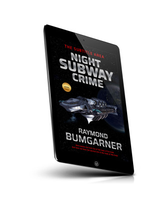 “A spaceship flies near a planet in space on the cover of a book titled "Night Subway Crime" by Raymond Bumgarner.”