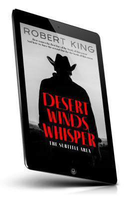 “A lone cowboy stands, silhouetted against a bright sky, facing away. The bold title "Desert Winds Whisper" appears below.”