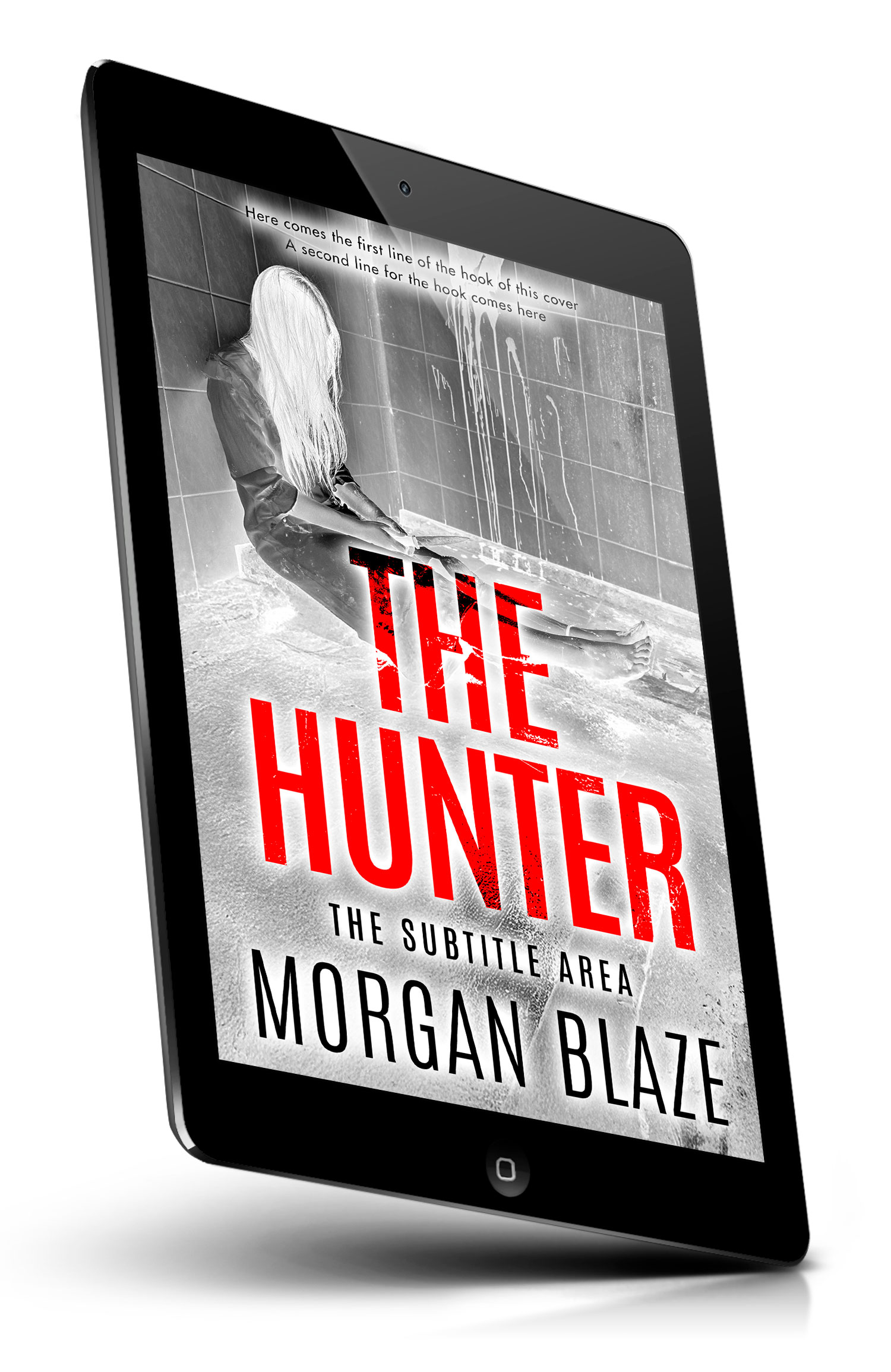 Tags: thriller, suspense, horror, mystery, crime, dark, gritty, monochrome, red accent, bathtub, tiled bathroom, blood splatter, distressed woman, long hair, vulnerability, isolation, captivity, psychological thriller, stalker, noir style, premade cover, book cover design, self-publishing, ebook cover, print ready