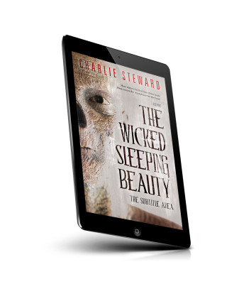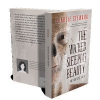“A book cover featuring a close-up of a creepy face, titled "The Wicked Sleeping Beauty" by Charlie Steward.”
