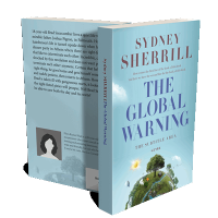 “A book cover depicting a floating island with diverse landscapes, featuring a tree, buildings, and a river, under a bright sky.”
