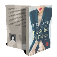 “A woman with red lips and dark attire is featured on the cover of a book titled "The String of Things" by Emery Bjelland.”