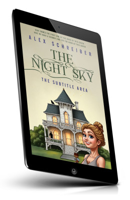 “A young woman stands in front of a Victorian house with a spire, lit windows, and a silhouette in the doorway.”