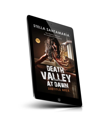 “A person with wild hair and white gown screams while climbing over a surface. Background is dark and eerie. Title: "DEATH VALLEY AT DAWN."”