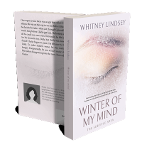 “Closed eye with frosty makeup, surrounded by a soft winter theme.”