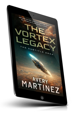 “A spaceship travels through space with a fiery backdrop, above which is a large title text that reads "THE VORTEX LEGACY."”