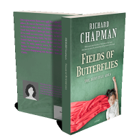 “A young girl with a ponytail lies on a red cloth against a green background in a book cover layout.”