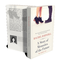 “Two people stand facing each other, showing only their legs and feet. The book cover features the title "A Story of Memories of the Future."”