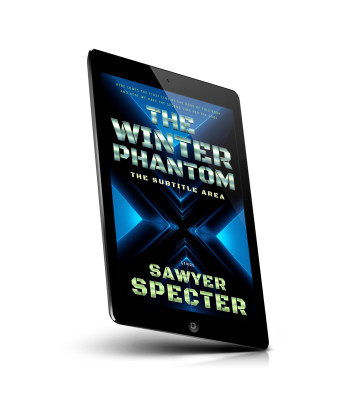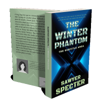 “A book cover with a blue and black geometric design featuring the title "The Winter Phantom" and the author "Sawyer Specter".”