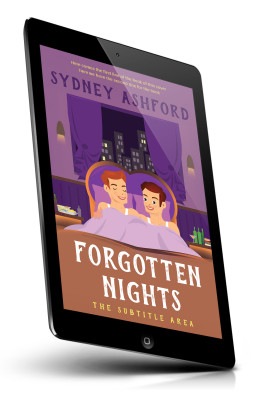 “Two people smiling in bed, with a cityscape view through a window behind them, framed by purple curtains. Book cover design.”