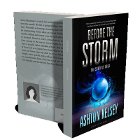 “A glowing crystal ball emitting blue light is at the center of a dark, stormy, and mysterious book cover.”