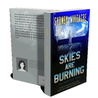 “An astronaut gazes at Earth from a space station window. The image has a sci-fi theme with the title "Skies Are Burning."”