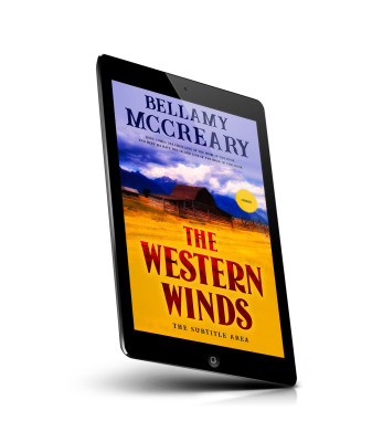 “A vivid book cover featuring a rustic barn, mountains, and a prominent title, "The Western Winds," amidst a fiery red and yellow background.”
