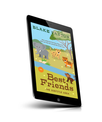 “An elephant, cheetah, tiger, and monkey stand under a tree by a river on a colorful book cover titled "Best Friends."”