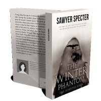 “A silhouette of a person with a bird in flight above, against a cloudy sky. Title: The Winter Phantom.”