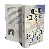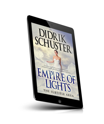 “A woman in a white dress stands against a cloudy sky backdrop on a book cover with the title "Empire of Lights".”