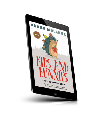 “A cheerful hedgehog holding an apple, surrounded by mushrooms and leaves, with the book title "Kids and Bunnies" in red text below.”