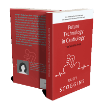 “A red book cover with a cyclist illustration, heart rate line, and text about future technology in cardiology by Rudy Scoggins.”