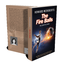 “A soccer player in action kicking a ball engulfed in flames against a dark background.”