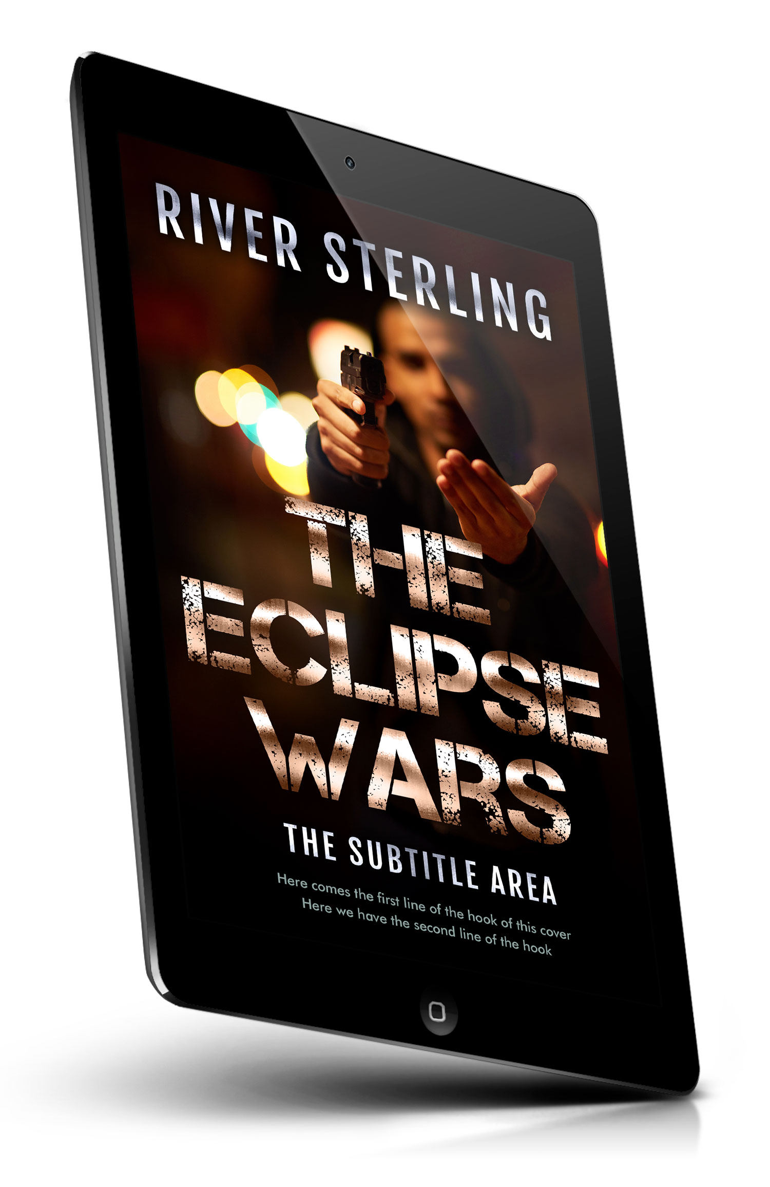 “Blurred figure aiming a handgun toward the viewer, with city lights bokeh in the background, resembling a thriller book cover.”