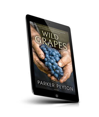 “Dirty hands holding a cluster of ripe, dark grapes.”