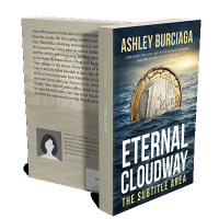 “A 1 euro coin above water is set against a serene sunset, with bold text overlay for a book titled "Eternal Cloudway".”