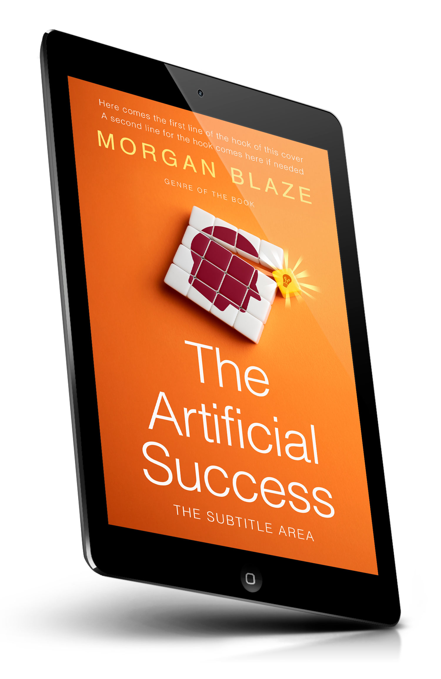 Tags: artificial intelligence, ai, technology, innovation, lightbulb, idea, brain, creativity, problem solving, puzzle, cube, rubiks cube, 3d render, minimal design, orange background, modern cover, concept art, digital illustration, strategy, success, premade cover, book cover design, self-publishing, ebook cover, print ready
