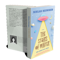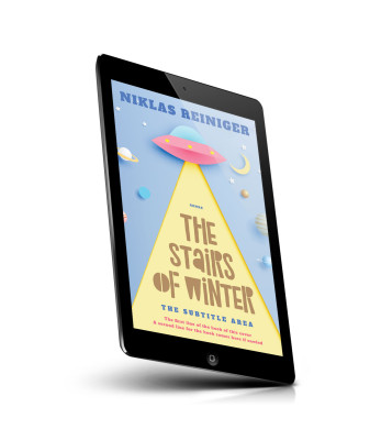 “A spaceship shines a light on the ground, surrounded by stars and planets, with the title "The Stairs of Winter" prominently displayed.”