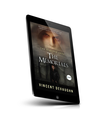 “A man in a leather jacket stands in a foggy forest with a large, shadowy face above him. The title, "The Memorials," is prominent.”