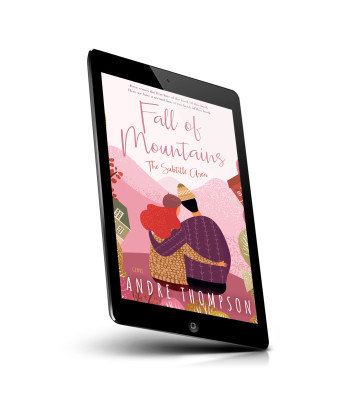“A cozy illustration of a couple embracing, surrounded by houses and mountains in a warm, pastel landscape.”