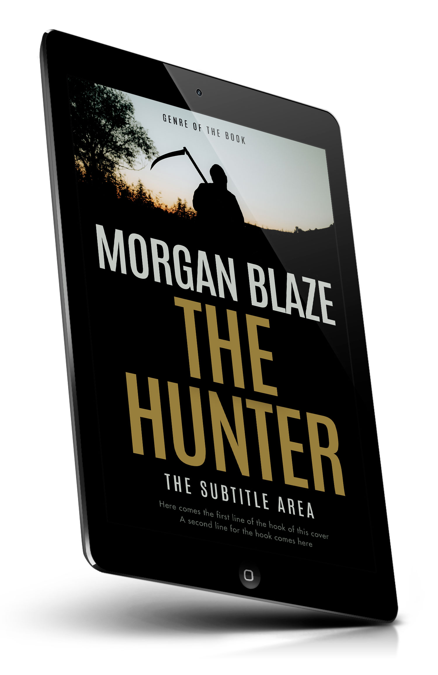 Tags: silhouette, hooded figure, scythe, grim reaper, reaper, dusk, sunset sky, twilight, dark horizon, lone figure, ominous, suspense, thriller, mystery, horror, foreboding, countryside, tall grass, tree silhouette, death theme, premade cover, book cover design, self-publishing, ebook cover, print ready