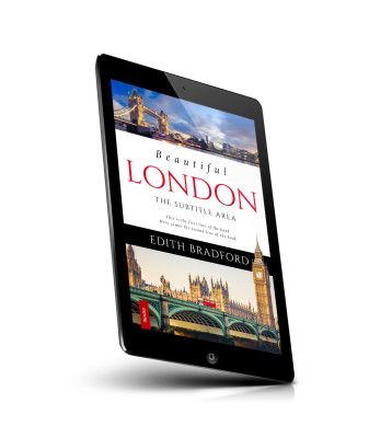 “A book cover with pictures of London landmarks, mainly the Tower Bridge and Big Ben, against a colorful sky.”