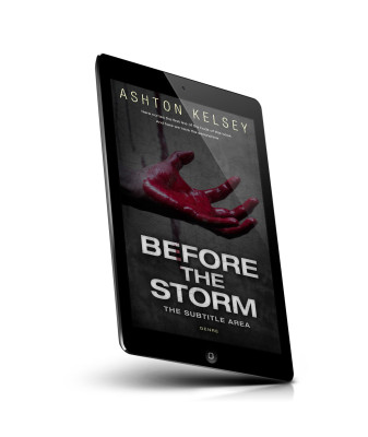 “A blood-covered hand reaches upwards on a dark, textured background with the title "Before The Storm" prominently displayed.”