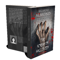 “A hand reaching upwards on a grungy, blood-splattered background, with large spooky text.”