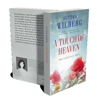 “Red poppies in a field under a cloudy sky with a book title and author's name written above.”