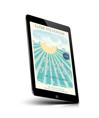 “Retro-style book cover with sun rays, clouds, and a blue-green background. Title in white cursive text; author at the top.”