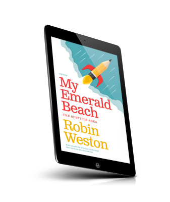 “A rocket pencil flying over ocean waves, with a bold, colorful title and author name.”