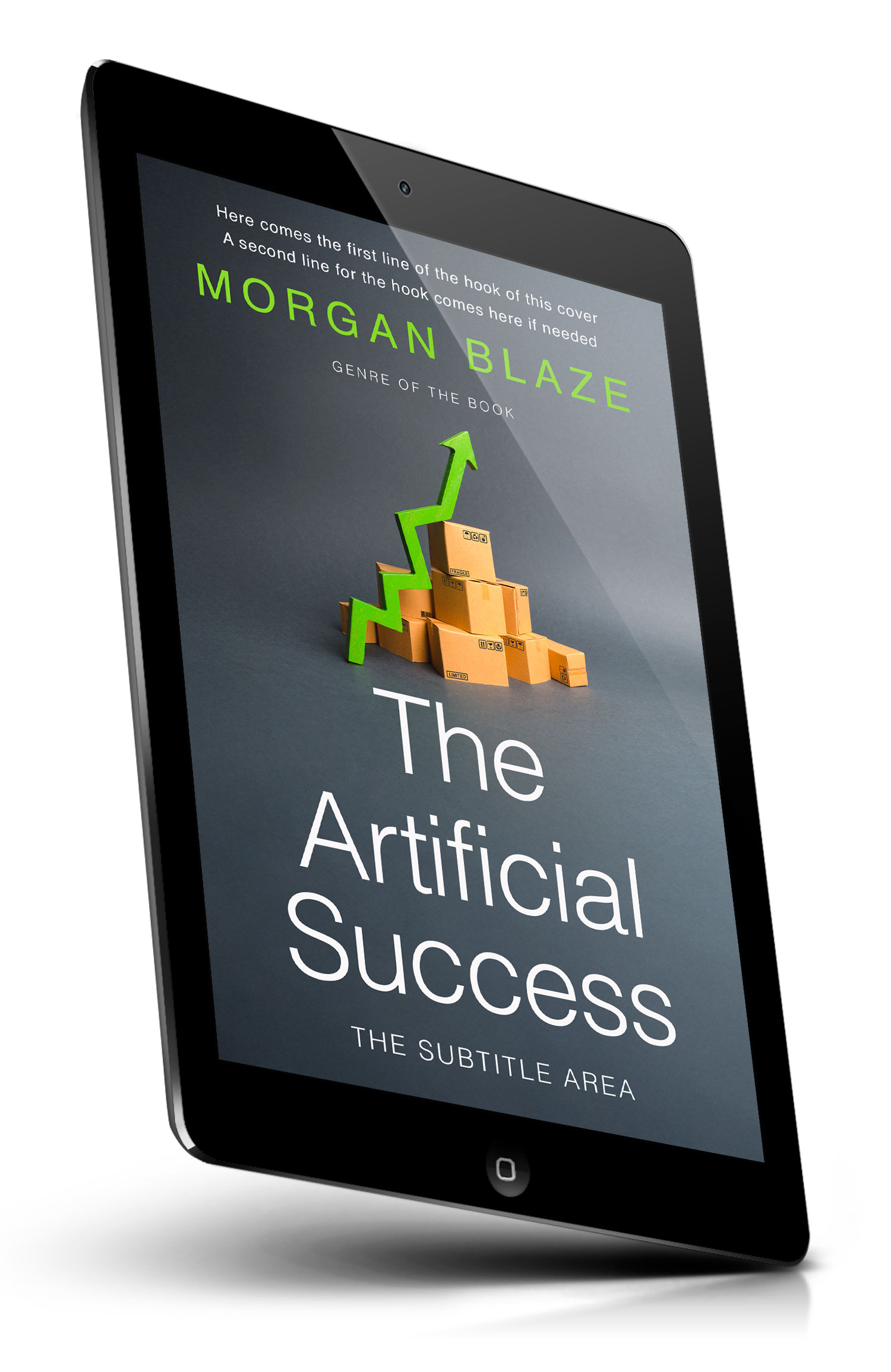 Tags: growth, success, upward arrow, green arrow, cardboard boxes, packaging, logistics, business, strategy, progress, startup, supply chain, productivity, innovation, analytics, market growth, scalability, achievement, minimalist design, dark background, premade cover, book cover design, self-publishing, ebook cover, print ready