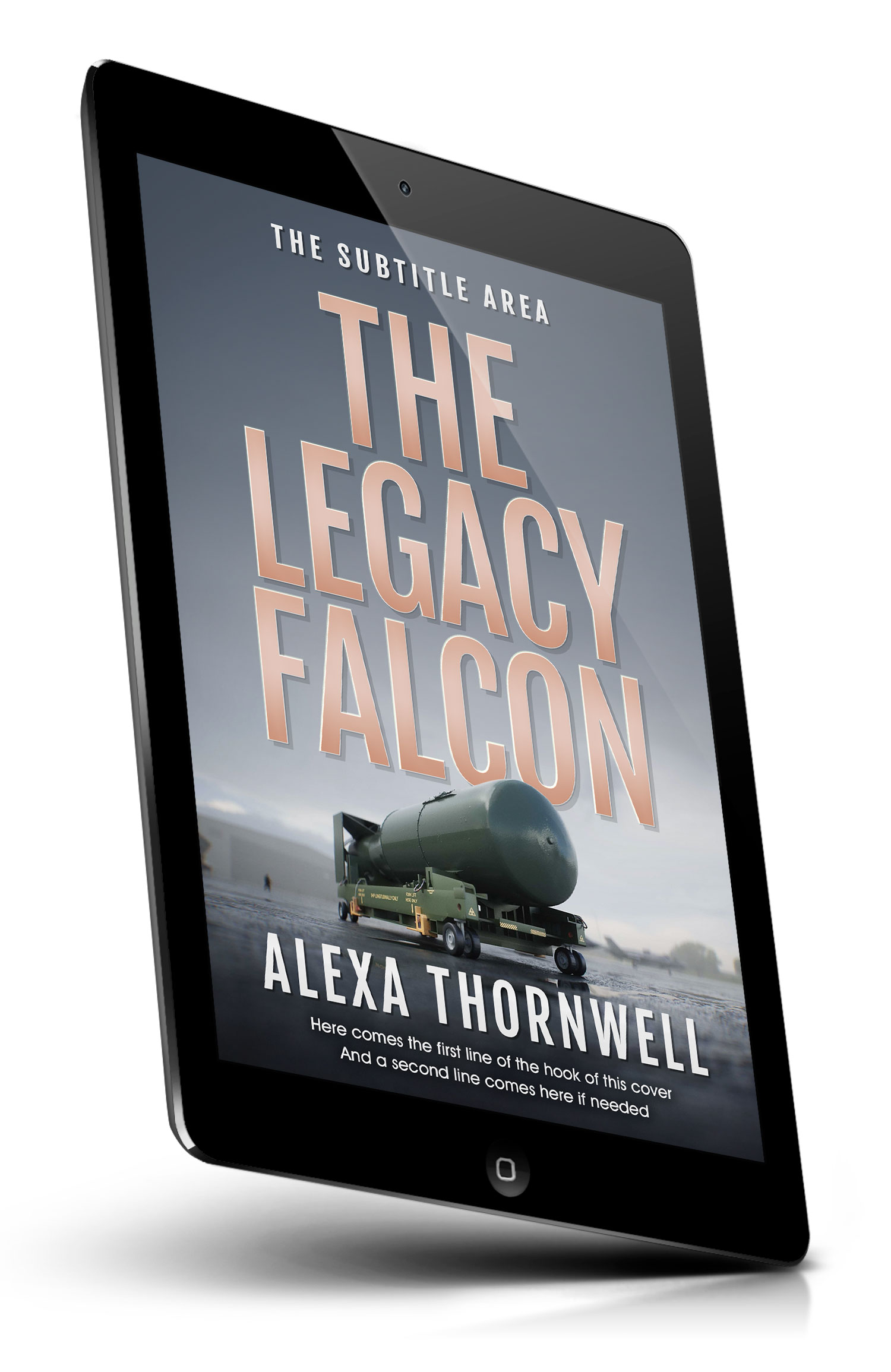 Tags: military, missile, warhead, rocket, weapon, nuclear, cold war, airfield, tarmac, runway, foggy, overcast, transport, trailer, convoy, industrial, aviation, aircraft silhouette, dramatic lighting, thriller cover
